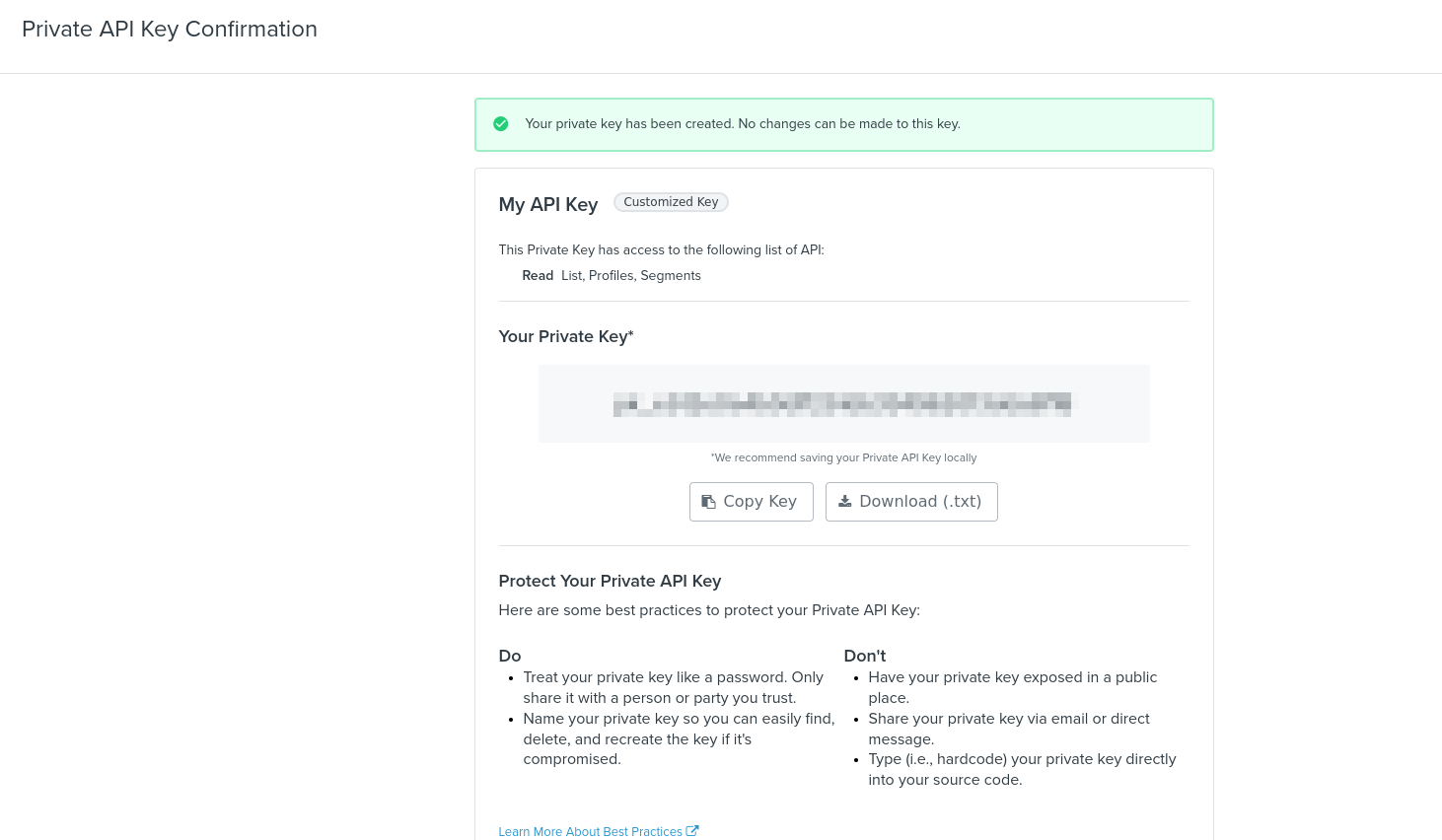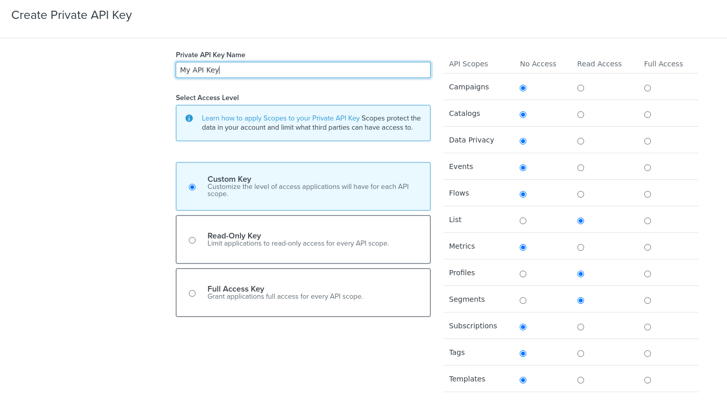 Crearemos una Custom Key con acceso de lectura a Listas, Perfiles y Segmentos.