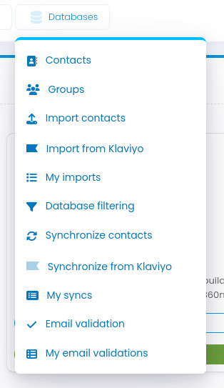 Una vez enlazada la plataforma {{NAME}} con Klaviyo, podremos ver en el menú Herramientas > Bases de datos dos opciones nuevas con el título Importar desde Klaviyo y Sincronizar desde Klaviyo.