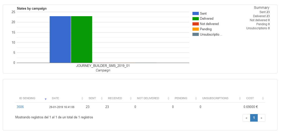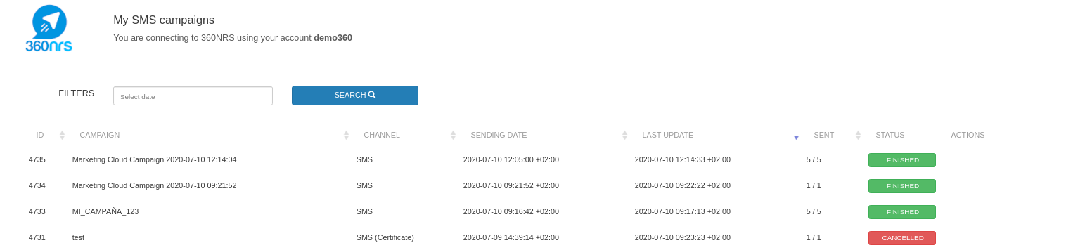 En el listado puede verse el estado actual de la campaña, los SMS enviados y las posibles acciones dependiendo del estado.