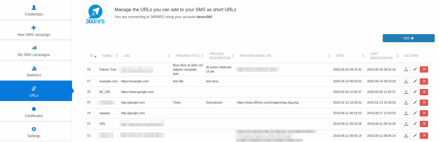 | URLs | Si se dan de alta las URLs en la sección URLs éstas aparecerán en el selector. Cuando se envíe el SMS el sistema reemplazará esa URL por una url corta para que ocupe menos espacio en el SMS. |