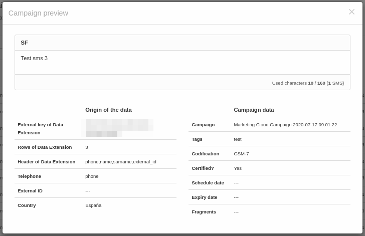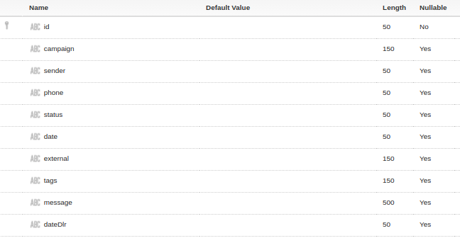 Para que se escriban las notificaciones correctamente, tu Data Extension debe tener al menos los siguientes atributos: id, campaign, sender, phone, status, date, dateDlr, external, tags y message.
