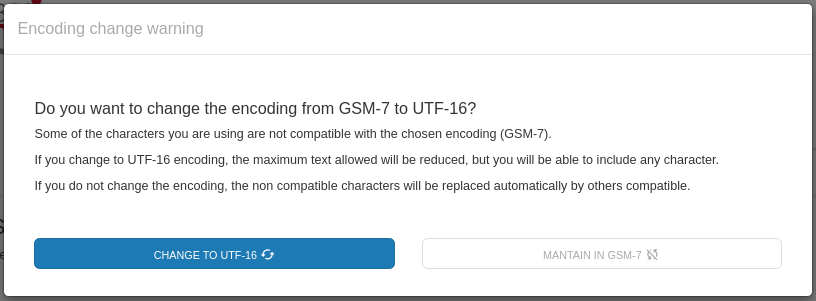 Si mientras escribes un SMS introduces algún caracter no compatible con la codificación que estás utilizando, se mostrará un mensaje de confirmación donde podrás cambiar de codificación o mantener la codificación actual.