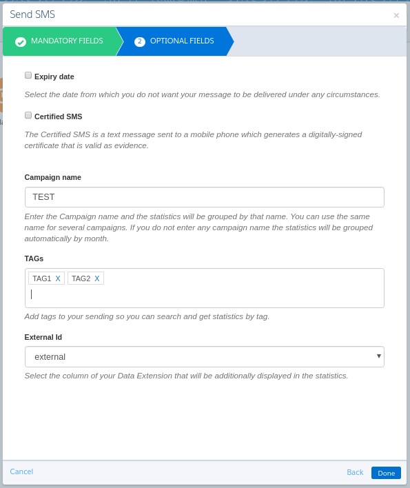 | Fecha de expiración | Fecha a partir de la cual no se enviará ningún SMS. |