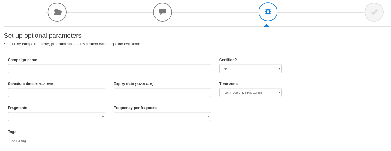 En este paso se configuran parámetros opcionales como Nombre de la campaña, certificado o no, fecha de programación, fecha de expiración, zona horaria y tags.