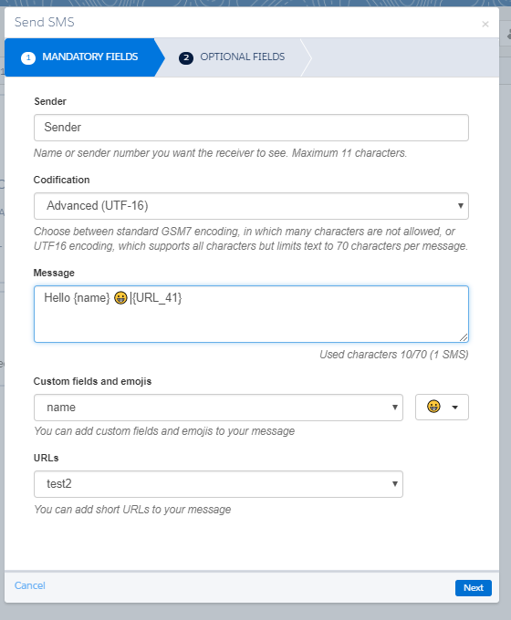 | Emojis | Es posible añadir emojis en el texto de SMS. Los emojis son caracteres especiales, por lo que no están soportados en GSM-7. Al añadir un emoji, el sistema te pedirá cambiar de codificación a UTF-16 para que se muestre correctamente. |