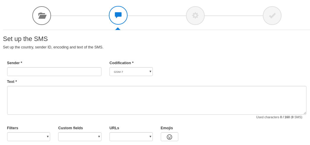 El asistente tiene cuatro pasos, en el primer paso se selecciona el origen de datos, en el segundo se configura el SMS, en el tercero se configuran los parámetros opcionales y en el cuarto se muestra una vista previa.