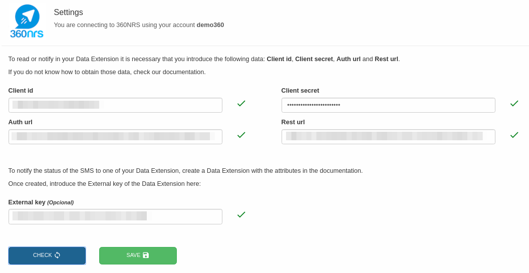 Si además, quieres escribir en uno de tus Data Extension los estados de las notificaciones de entrega de los SMS, debes introducir el External Key del Data Extension donde quieras escribirlos.